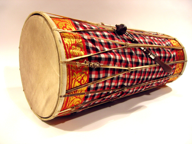 The kendhang is a two-headed, barrel shaped, asymmetrical drum with heads that are stretched with leather hoops laced in a “Y” pattern. Held horizontally on the stand, kendhang is played with bare hands (part of the palm and/or fingers). Commonly, the large head is played with the right hand, the small head with the left hand. Although not always present, there is another kind of drum called bedhug. It is a large, symmetrical, barrel-shaped drum with two nailed heads of the same diameter. The bedhug is hung on a stand or placed on a wooden frame. It is played with a mallet. It is exclusively played for loud pieces or for accompanying dance.